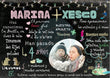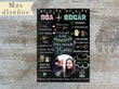 Lámina para parejas personalizada con los nombres y los siguientes datos: Nos conocimos / El primer beso fue / Tenemos / Llevamos / Han pasado / Nos apasiona / Nuestro amuleto / Nuestro sueño y sube vuestra foto favorita.