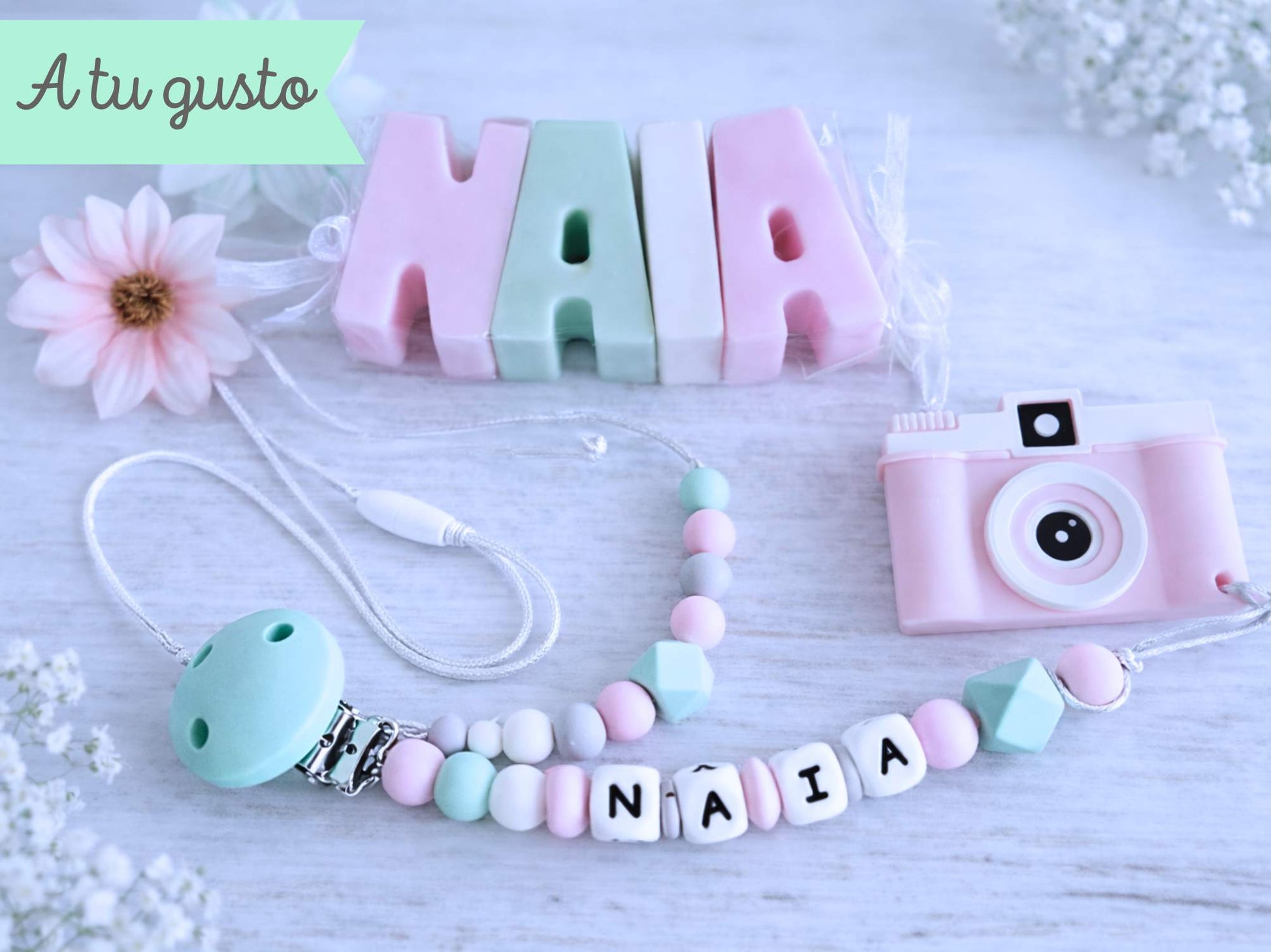 Un pack con chupetero de silicona personalizado y el collar de lactancia a juego. Un detalle original, bonito y práctico.